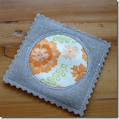 6. Stitch once around design to secure pieces. Stitch around edge of whole coaster, approximately 1/4” from the edge.